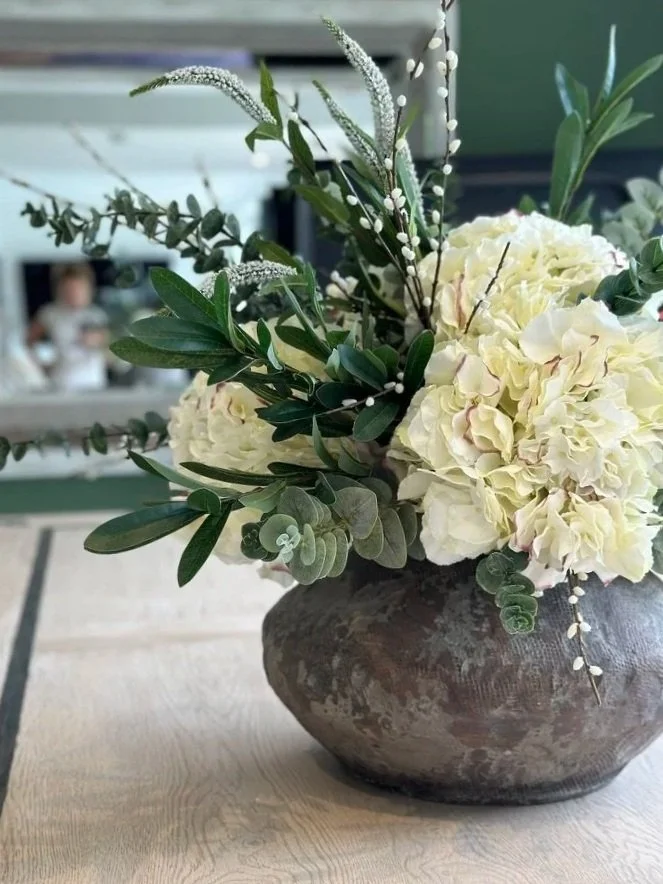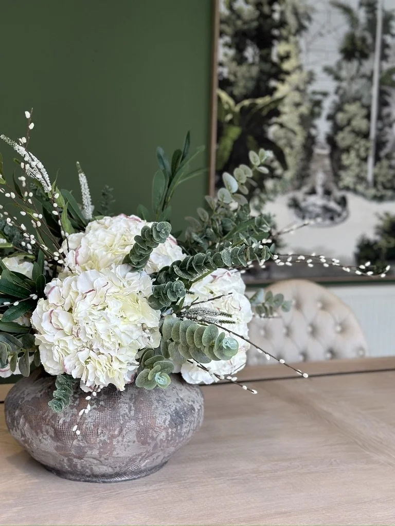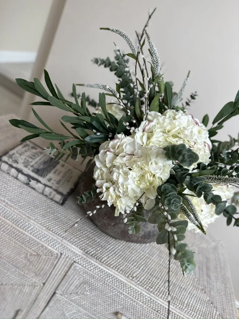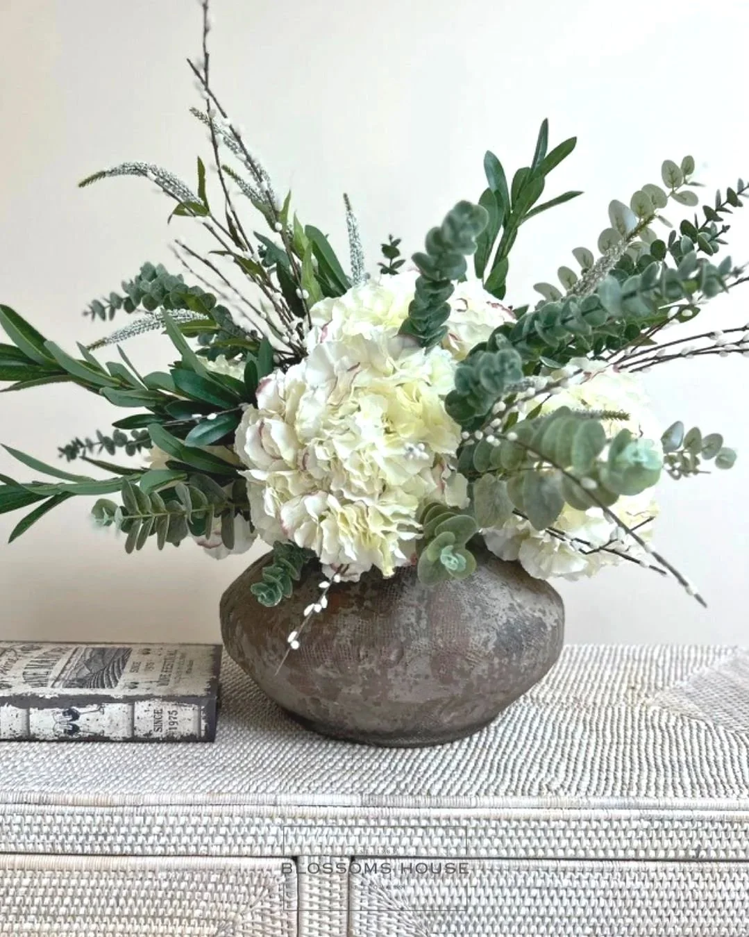 Five flower & foliage elements: hydrangeas, eucalyptus, pussy willow, and greenery—a winning combination for depth and style in every season.