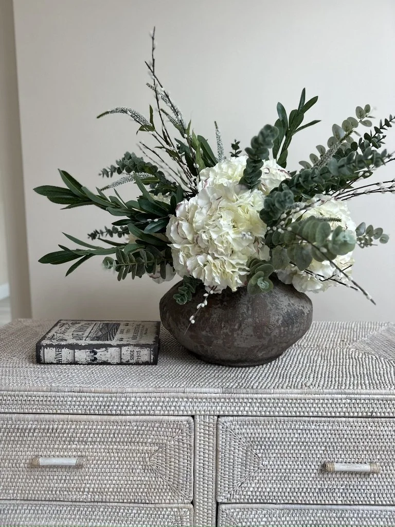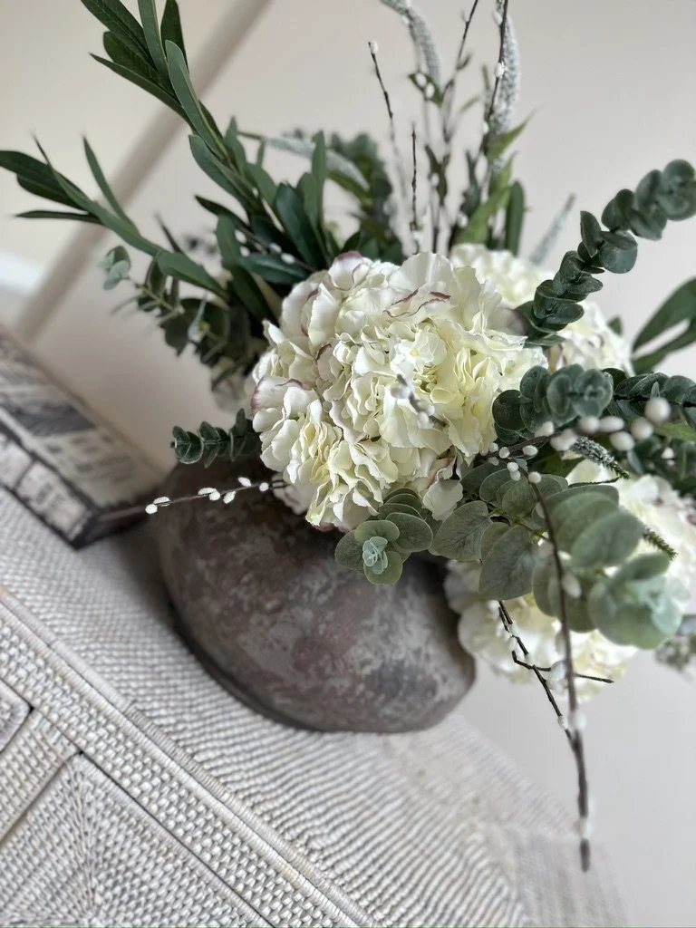 Elevate your interiors with our Equinox Faux Flower Arrangement—a luxury artificial centerpiece featuring grey hydrangeas, seeded eucalyptus, baby giant eucalyptus, berries Olive branches and Thistles, and natural foliage. This English-garden inspired display brings a lush, textured look without the upkeep.